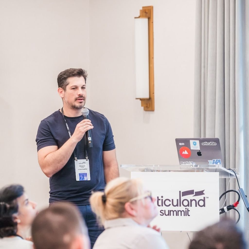 É também palestrante em eventos oficiais da Articulate, como Articuland Boston e Articulate User Conference Las Vegas. No Brasil, é presença constante em eventos como CBTD e CONARH, compartilhando as melhores práticas em Articulate, Learning Analytics, Design Instrucional, Gameficação e Produção de Aprendizado Digital.